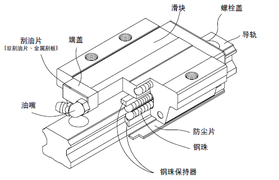 滾動循環(huán)系統(tǒng):滑塊、導(dǎo)軌、端蓋、鋼珠、鋼珠保持器