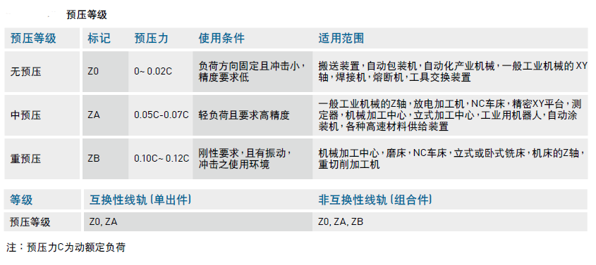 QH 系列直線導軌提供三種標準預壓,可依據(jù)用途選擇適當預壓力。